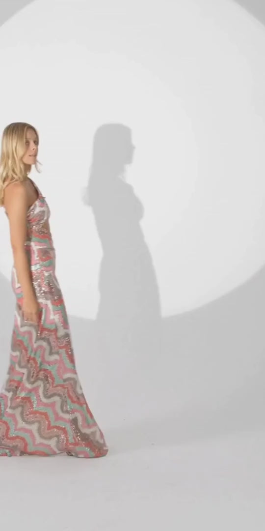 Introducing the alluring Celeste Gown, a dazzling masterpiece of fashion. Crafted from vibrant sequin fabric, this gown showcases a colourful and ultra-shiny allure. The cut-out waist and back reveal a hint of skin, while the high thigh side slit adds a touch of drama. Adorned with shimmering stones at the edges, this gown captures the light and creates a mesmerizing effect. Perfect for glamorous occasions, the Celeste Gown is a true showstopper.