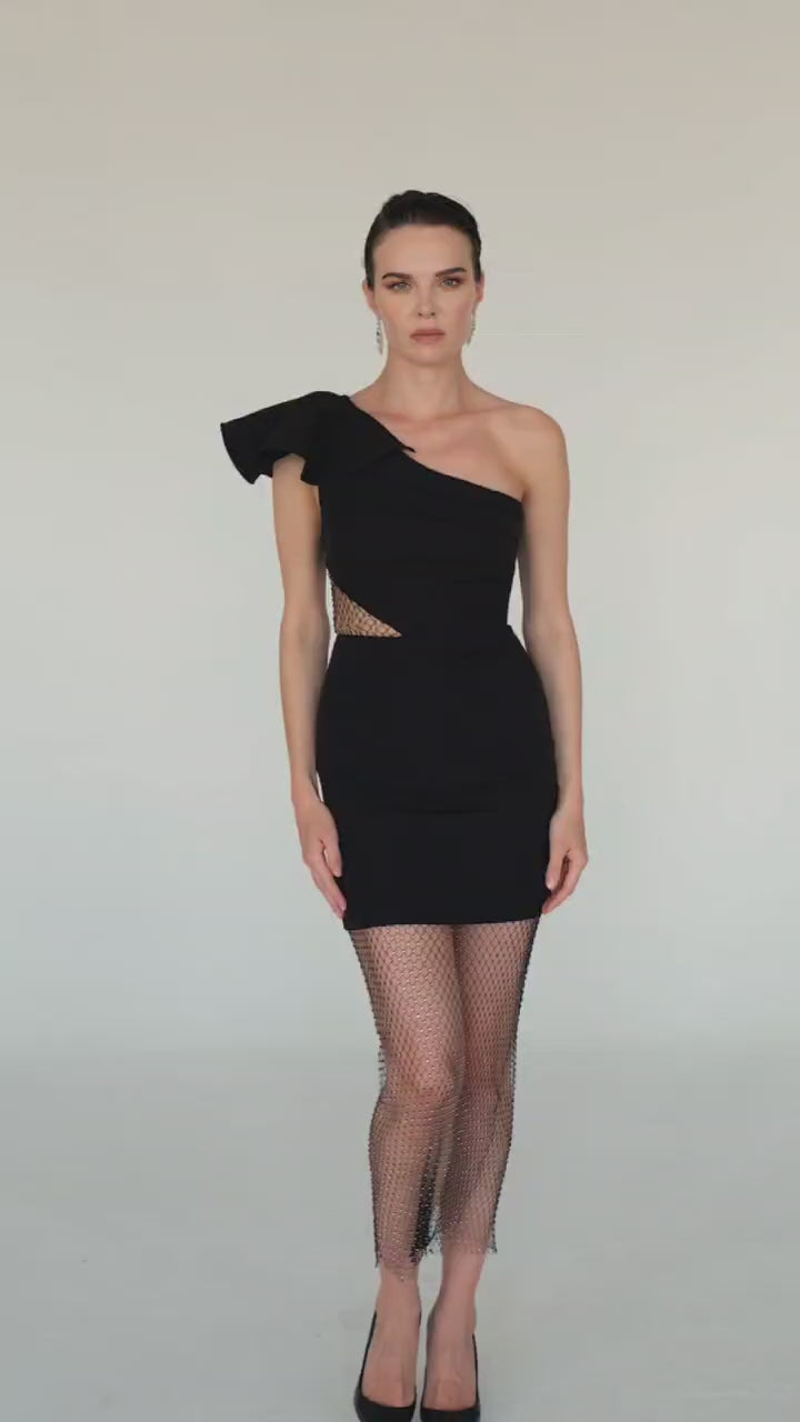 Step into the spotlight with the Luna Dress, an elegant mini dress that combines sophistication with a touch of daring flair. This one-shoulder design features a striking asymmetrical silhouette with a stylish ruffle detail on the shoulder and a captivating cut-out waist. The dress is finished with a unique crystal mesh overlay, adding a modern edge and eye-catching shimmer to the legs. Perfect for fashion-forward occasions, the Luna Dress is the ideal choice for those who want to make a statement with grace and confidence.